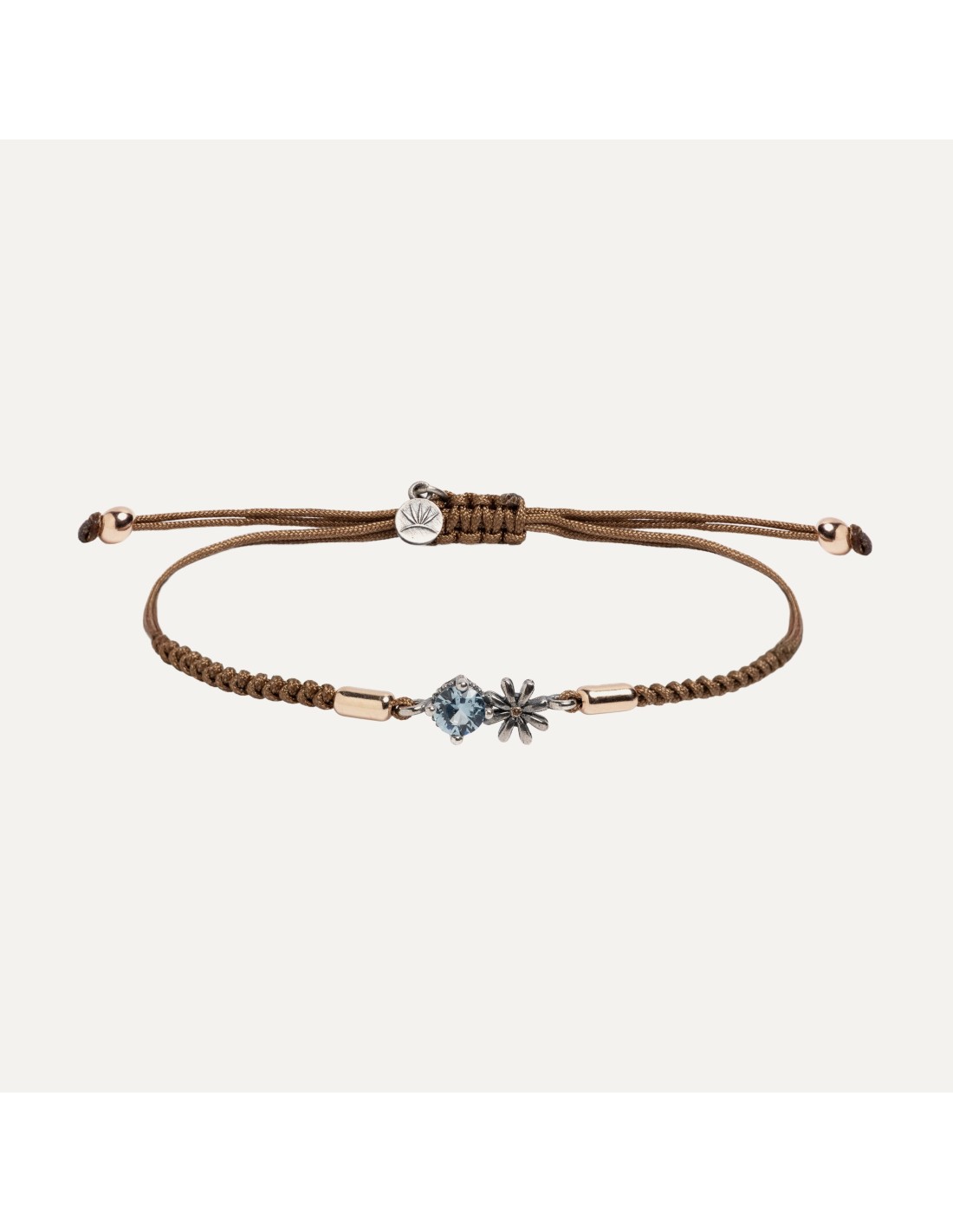 Pulsera artesanal de plata con flor en relieve y circonita azul aguamarina. Un detalle cava añade contraste y calidez. Hecha a mano en España, femenina y sofisticada.