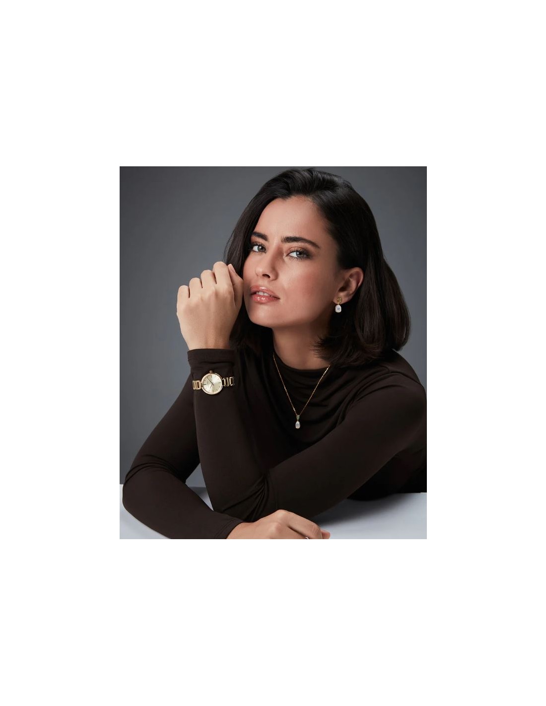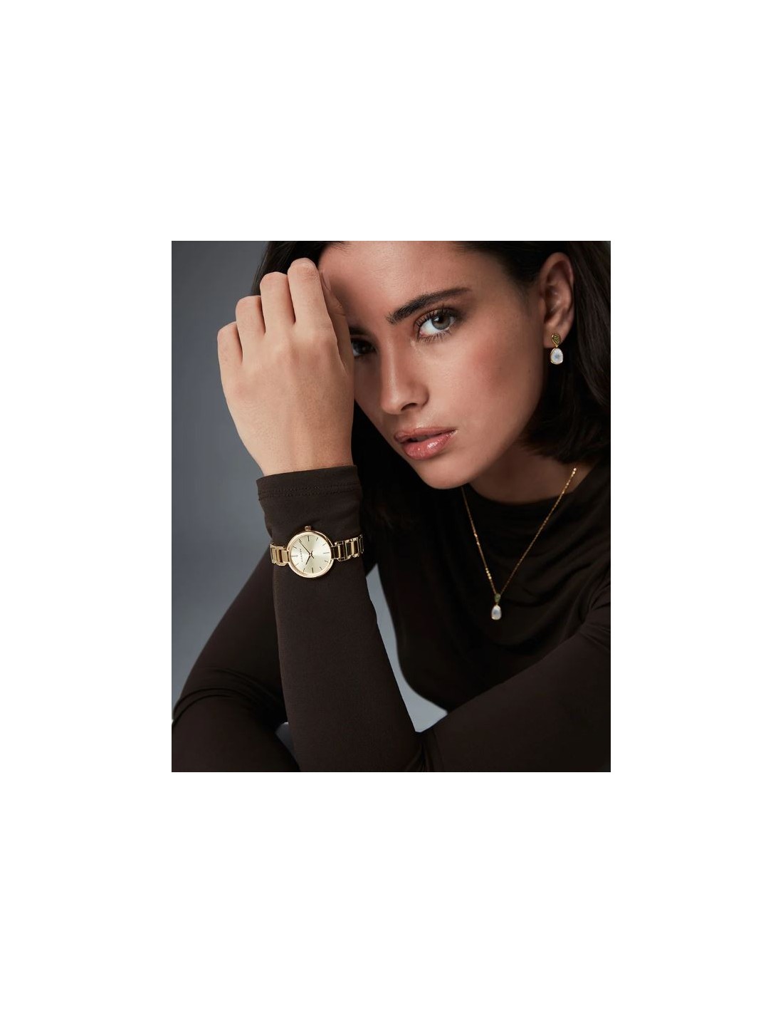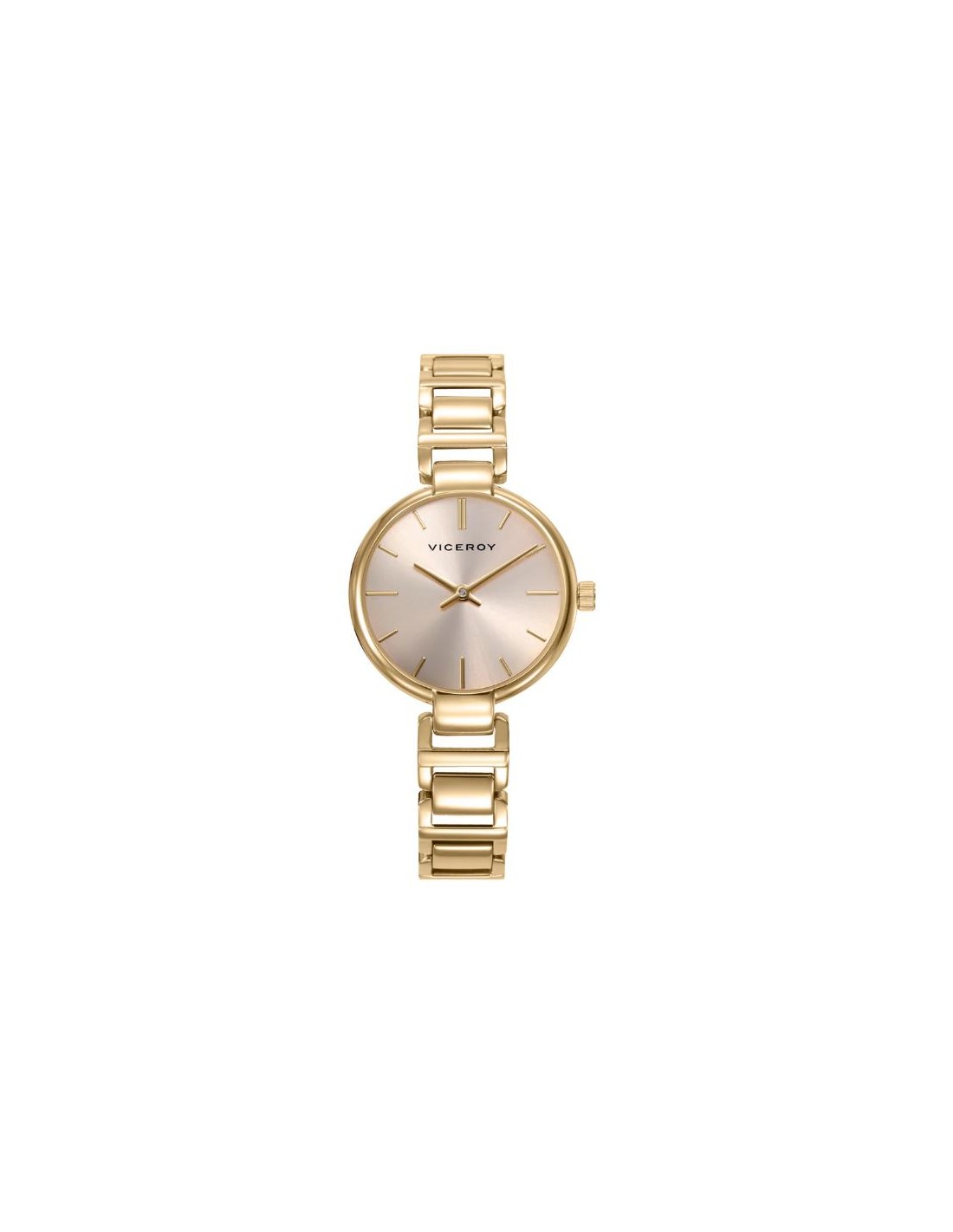 Modelo femenino de reloj de dos agujas que combina caja y brazalete de acero con baño Ip dorado, ofreciendo un acabado brillante y resistente. Su esfera dorada presenta índices discretos y agujas a juego, mientras el cristal mineral asegura protección y durabilidad, convirtiéndolo en un accesorio elegante y atemporal para cualquier ocasión.