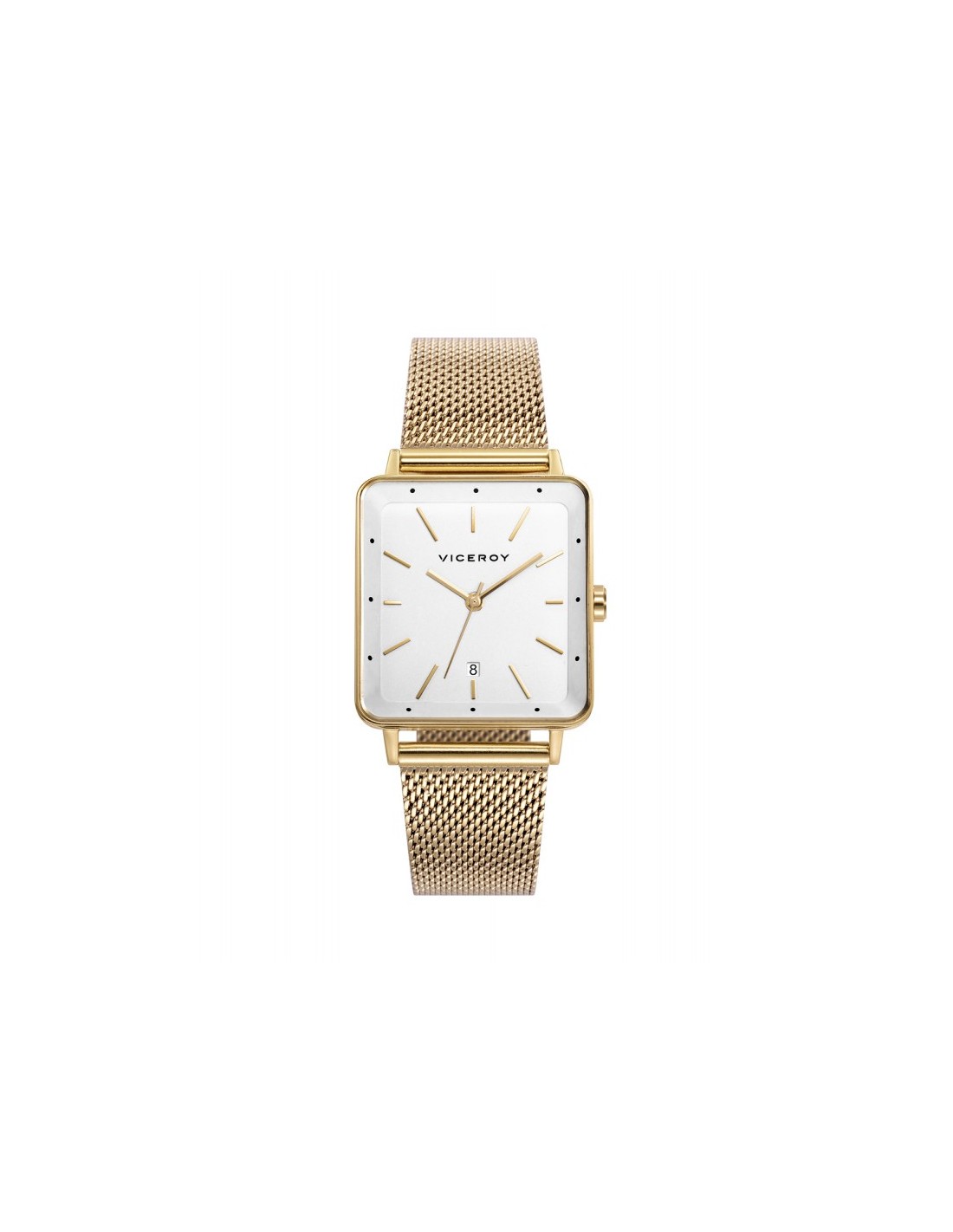 Reloj de Mujer Viceroy Air tres agujas con la caja cuadrada de acero IP dorado, la esfera blanca con los índices dorados y el calendario a las 6 y malla milanesa