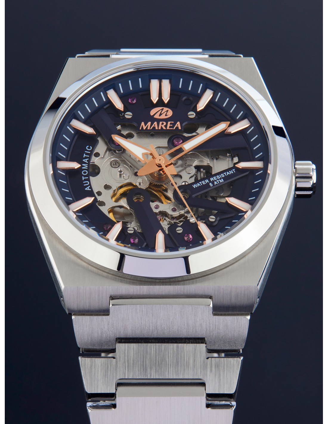 Esfera: Color azul oscuro con agujas e índices color cobre y movimiento automático visible.