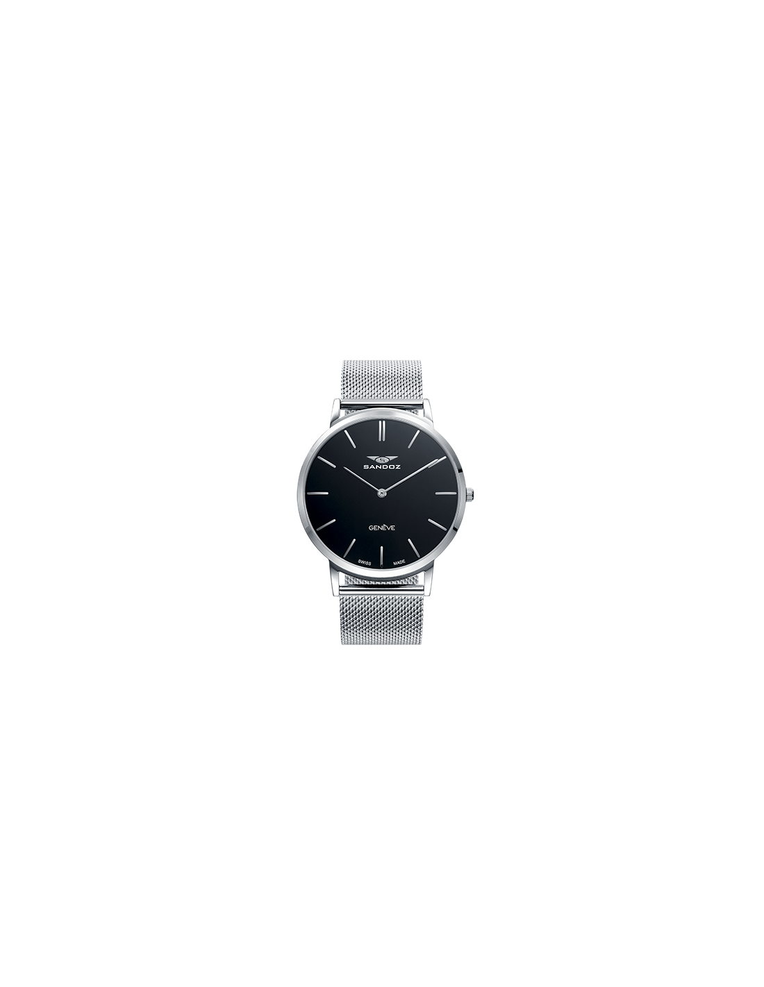 Sandoz en acero con brazalete de malla tipo milanesa reloj plano.